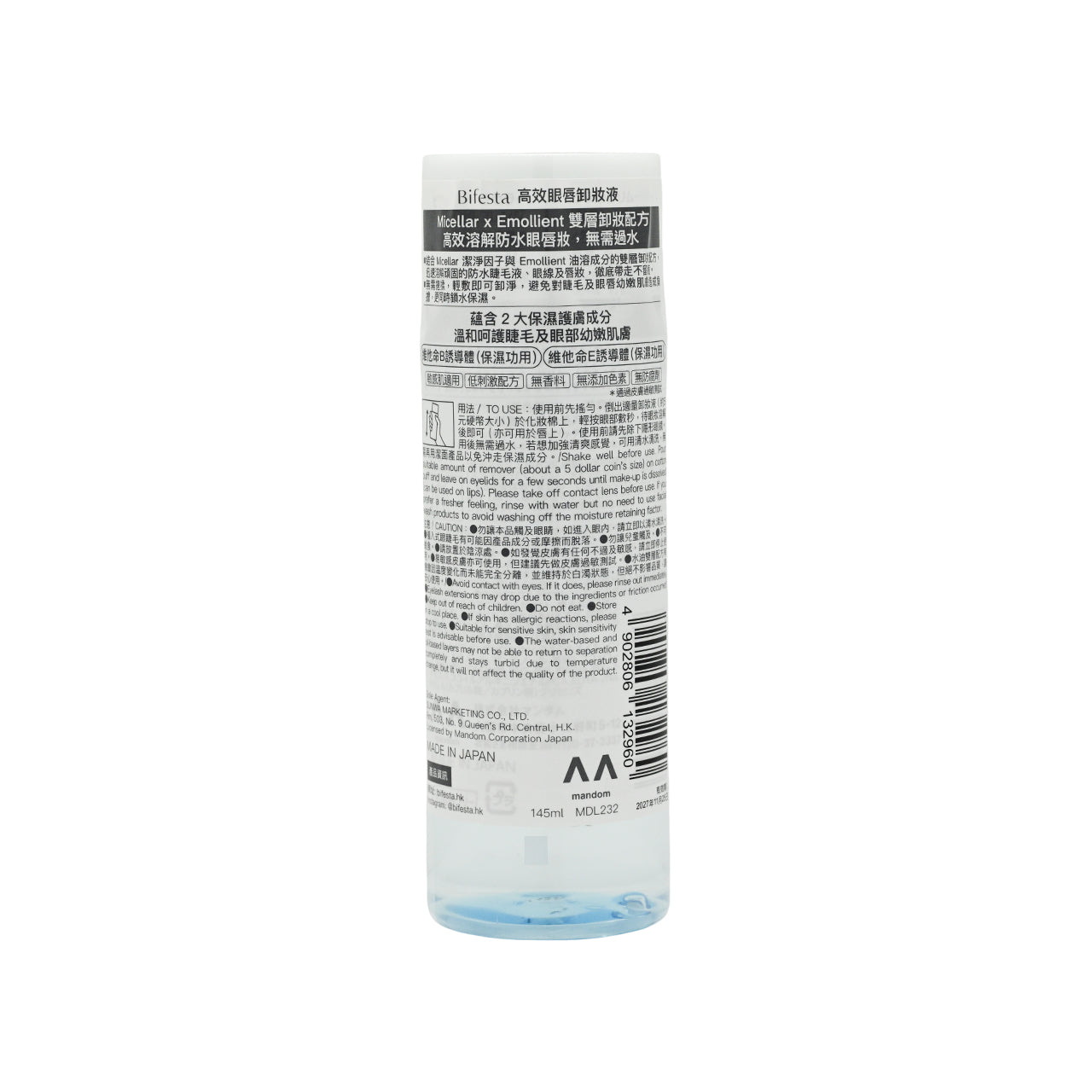 •Uses a dual-layer makeup removal formula containing Micellar cleansing ingredients and Emollient oil-soluble ingredients, which easily dissolve makeup without the need for vigorous rubbing.