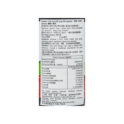 Parallel Import Jamieson Folic Acid 400 Mcg 200 Capsules